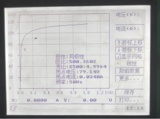 二是能夠判別電流互感器能否發(fā)作匝間短路。拐點(diǎn)電壓位置的電流互感器鐵芯進(jìn)入豐滿狀態(tài),此刻勵(lì)磁電流幾乎悉數(shù)損耗在鐵芯發(fā)熱上,當(dāng)電流互感器二次繞組匝間短路時(shí),在電流互感器伏安特性上表現(xiàn)為拐點(diǎn)電壓U有明顯的降落,據(jù)此能夠判別電流互感器二次繞組反常。