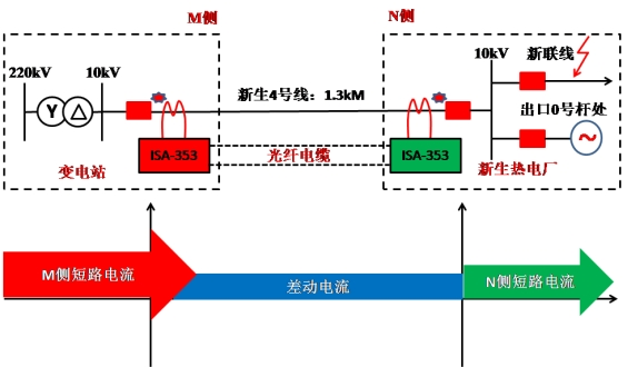 2007年8月5日某220kV變電站10kV重生4號(hào)線光纖分相電流差動(dòng)維護(hù)動(dòng)作,開關(guān)跳閘,經(jīng)巡線人員查看、故障點(diǎn)在新聯(lián)線出口0號(hào)桿處維護(hù)人員查看兩邊維護(hù)安裝,模仿區(qū)內(nèi)外故障維護(hù)均反響正確,如下圖所示,試分析跳閘緣由。