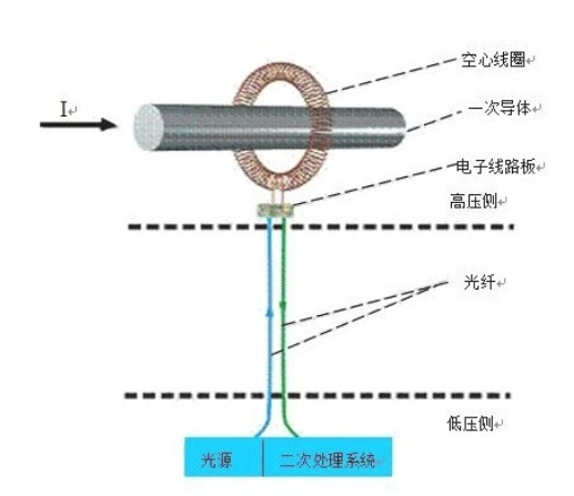 有源型電子式電流互感器特征是一次傳感器為空心線圈,高壓側電子器件需求由電源供電方能作業。其原理如下圖所示: