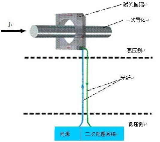 無源磁光玻璃型電子式電流互感器特征是一次傳感器為磁光玻璃,無需電源供電。其原理如下圖所示: